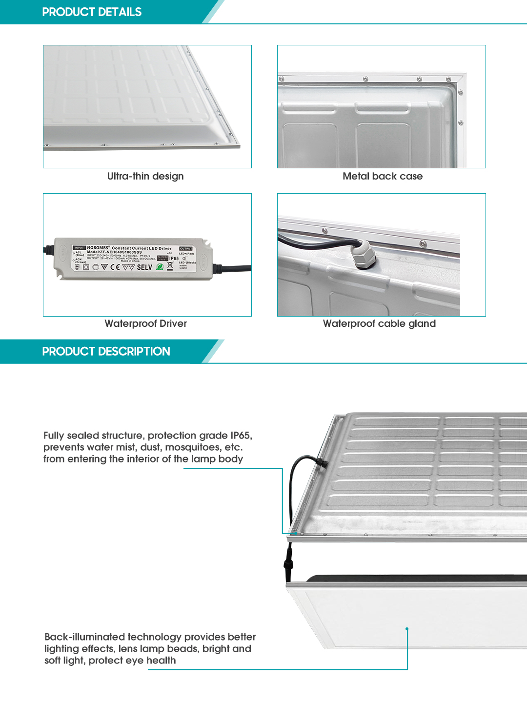 ·The SP-B-65 panel light adopts a fully sealed structure, with imported high-efficiency silicone seal inside, equipped with waterproof plugs, with super waterproof, moisture-proof and dust-proof performance, protection level IP65, to avoid line short circuit, aging, etc.