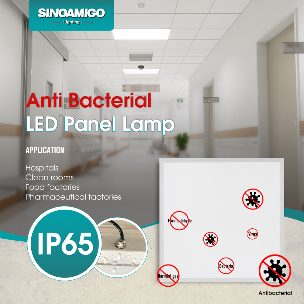 SINOAMIGO LIGHTAMIGO’s SP-A (IP65) anti-bacterial panel light is a lamp that combines sterilizing and waterproof functions. This lamp can not only kill bacteria, viruses and other microorganisms, but also has a waterproof cable gland design and a waterproof rating of IP65, so that it can work normally in a humid environment and meet the hygienic needs in a humid environment.