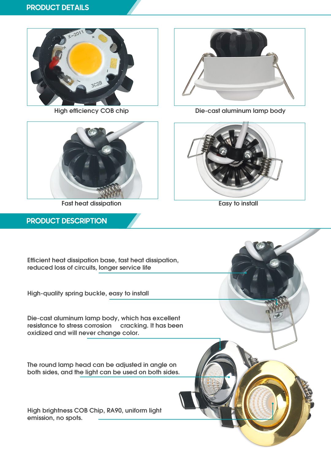 SA-SCS-C small spotlight adopts Philips COB light source, integrated chip, more beautiful appearance, the chip is a point source, the light is uniform, the thermal resistance is smaller, the light decay is small, the brightness is high, and the color rendering performance is better.