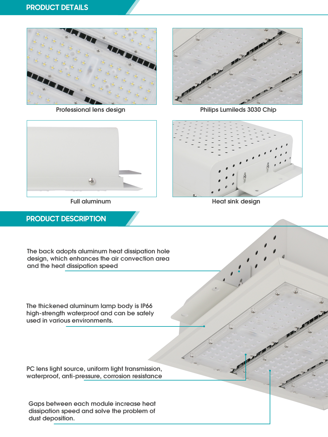 2. The lamp body adopts modular design and uses Philips Lumiled 3030 chip, which can effectively improve the uniformity of lighting, prolong the service life of lamps and reduce power consumption. Lens lamp beads illuminate farther, enhance the efficiency and brightness of light use, low UGR to avoid glare, highlight the overall space lighting, and improve the overall brightness of the gas station.