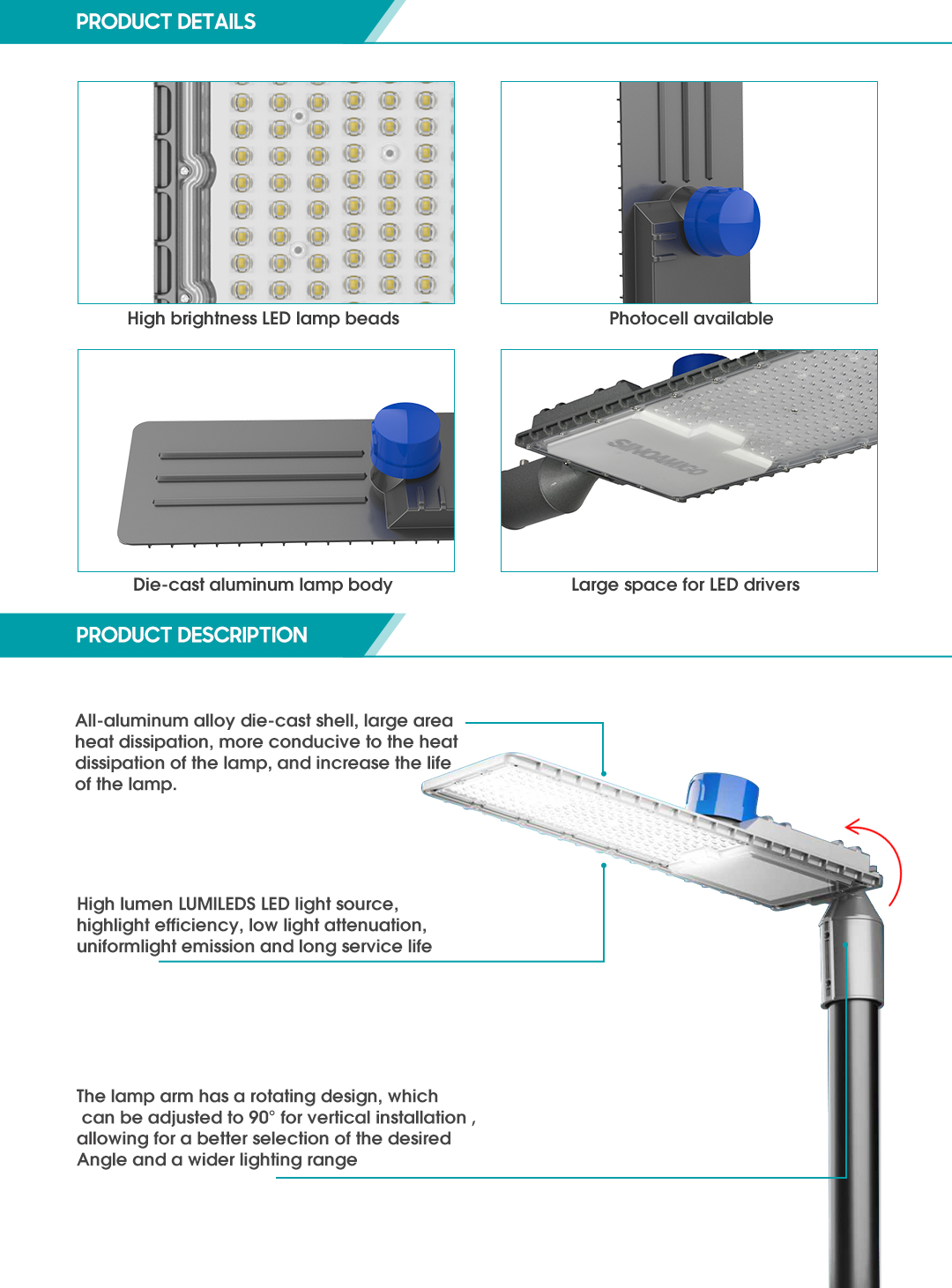 1. The main body of the SL-R6 street lamp is made of die-cast aluminum shell. The surface is coated with anti-corrosion powder, featuring excellent heat dissipation performance. The back of the lamp body adopts a vertical strip design to increase the heat dissipation area, making it safer and more durable to use. It is widely applicable to various environments.