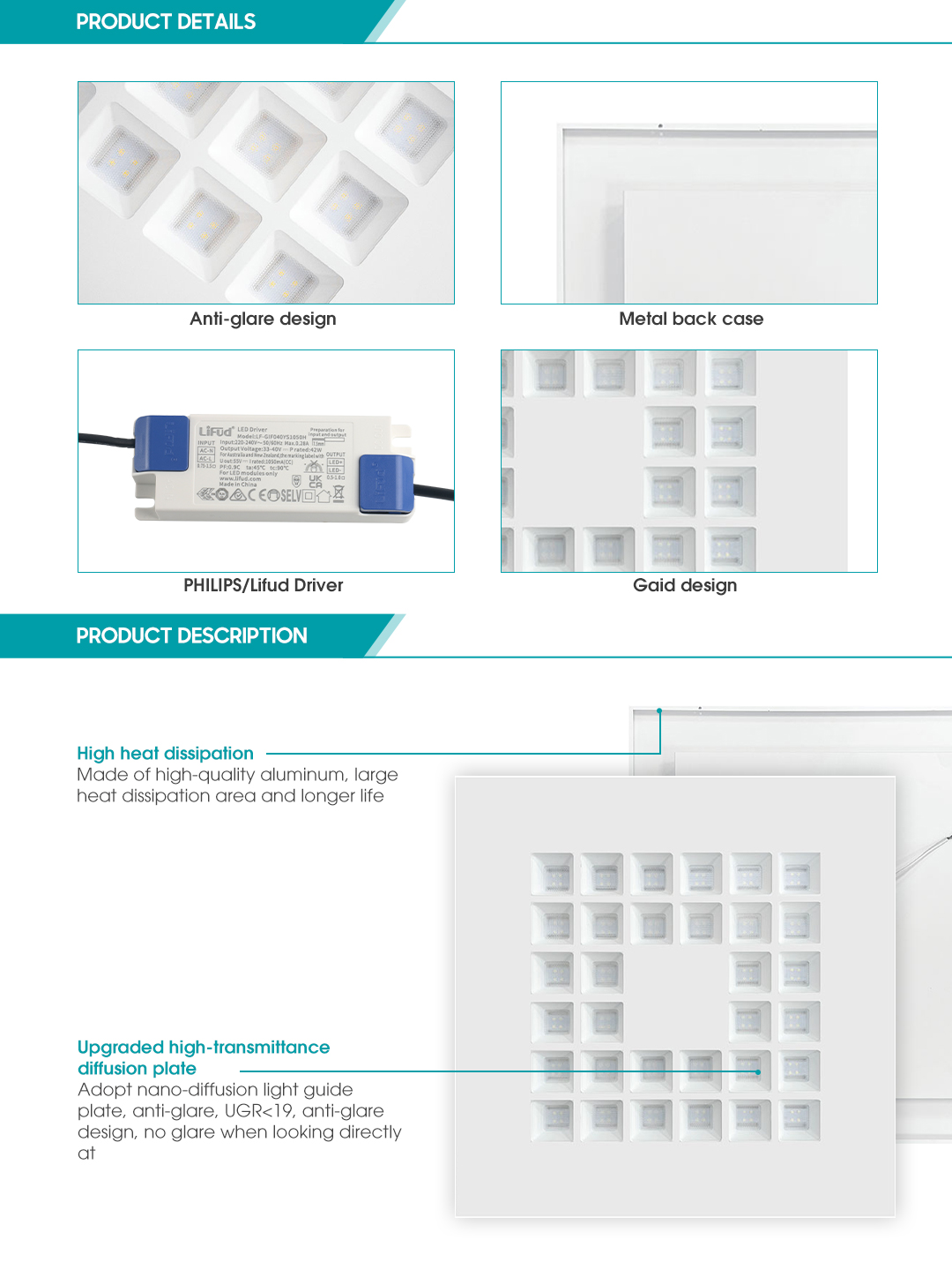 1. The SP-B-G panel light adopts a grille design, with a simple and elegant appearance. The lamp body is made of high-quality thickened metal material, the surface is powder-coated, the workmanship is fine, the heat dissipation is fast, corrosion-resistant, durable, and not easy to deform.