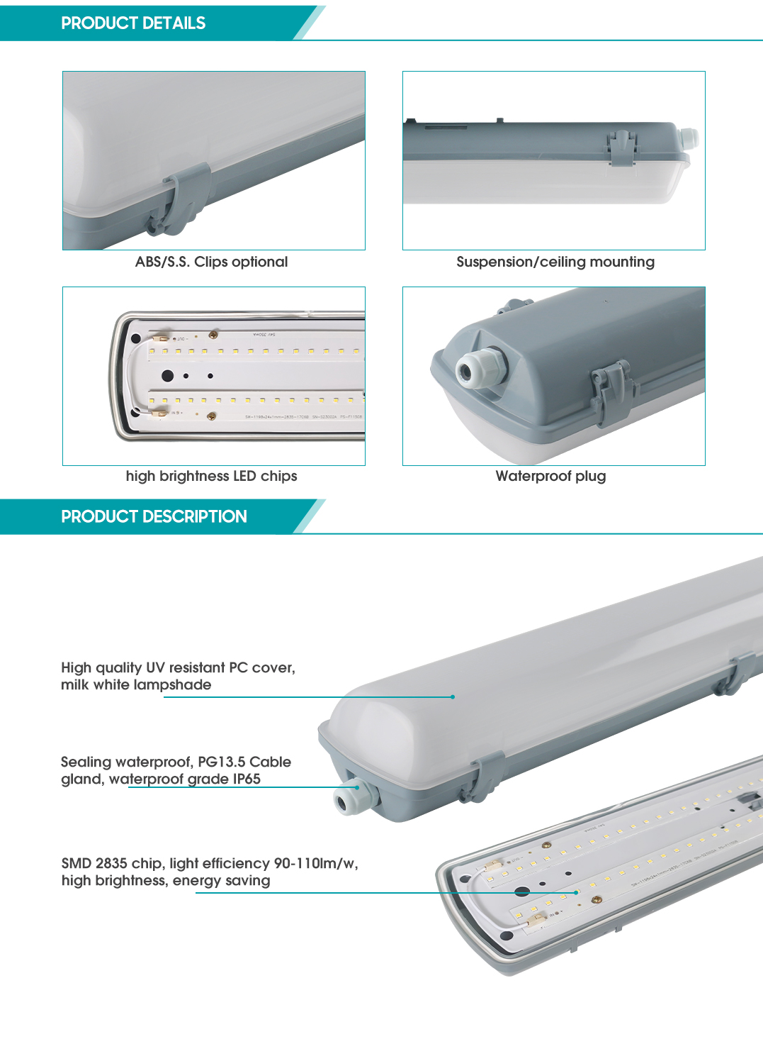 2. This tri-proof light uses a milky white lampshade, which emits even, soft and non-glaring light. The color rendering index is RA80, which can achieve good optical effects.